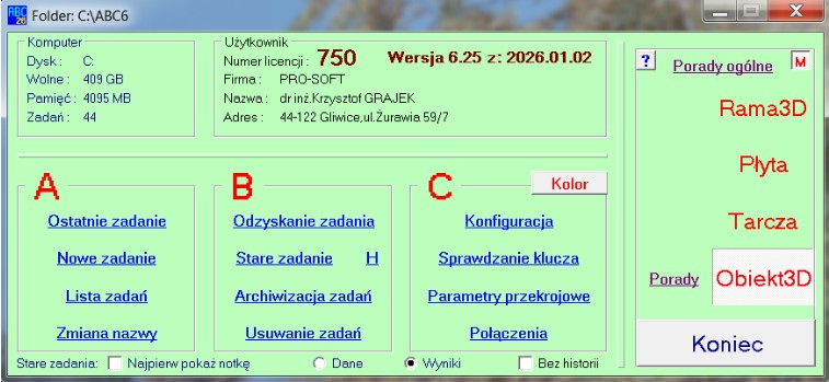 Program zawiera wszystkie funkcjonalności programów ABC Płyta, ABC Tarcza oraz ABC Rama3D.