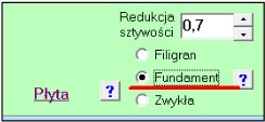 Po wybraniu przycisku Płyta pokaże się wybór typu płyty. Płyta zwykła pozwala modelować zwykłą płytę izotropową lub płytę ortotropową. W płycie ortotropowej zadawana jest grubość dla płyt kanałowych, gęstożebrowych lub można wprowadzić pełny opis grubości. Po włączeniu płyty typu Fundament będzie można wpisać stopień zmiany sztywności wywołany zarysowaniem.