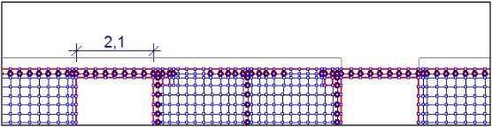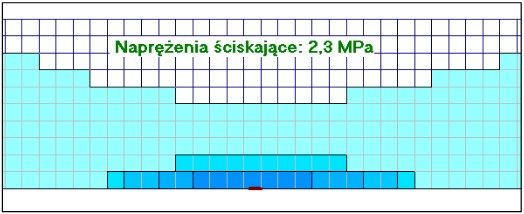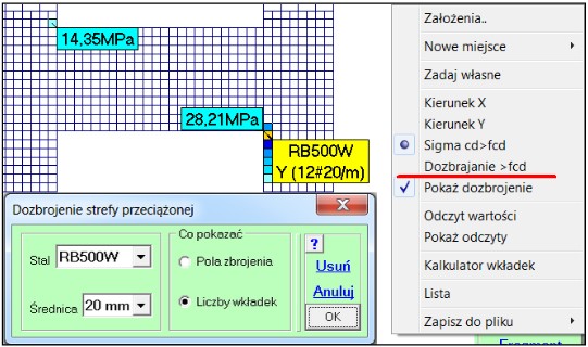 Jeśli w danym elemencie występują naprężenia ściskające i rozciągające, to, jeśli naprężenie rozciągające będzie większe od ilorazu liczby Poissona`a (ν) i naprężenia ściskającego, wartość fcd zostanie zredukowana o współczynnik zależny od fck. Jeśli warunek naprężeń ściskających jest zachowany, to na rysunku rozkładu zbrojenia pokaże się zielony napis z wartością maksymalną. W przeciwnym wypadku pokaże się ostrzeżenie i pojawi się przycisk >fcd.