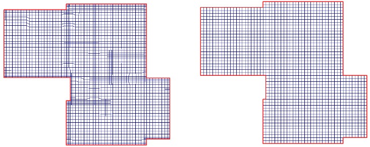 Siatka do wyznaczenia podłoża ekwiwalentnego nie musi mieć takiego samego podziału jak siatka podstawowa. Może mieć, a nawet powinna mieć podział regularny. Unika się w ten sposób trudnych do interpretacji wyników. Po lewej stronie siatka do wymiarowania płyty, po prawej siatka do wyznaczenia ekwiwalentnego podłoża Winklera. Obie siatki muszą mieć tylko taki sam kształt. Przy zadaniach Obiektowych model do wyznaczenia ekwiwalentnego podłoża Winklera może być płytowy.
