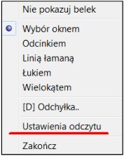 Dokonując odczytu dowolnej wielkości, po naciśnięciu prawego przycisku myszy, pokaże się menu z opcją Ustawienia odczytu. Po wybraniu tej opcji pokaże się okno, w którym można wybrać kolor tła, napisu i linii. Ta ostatnia może być pogrubiona. Do tego można zmienić wielkość czcionki odczytu. Ponadto można zmienić wstępną odległość plakietki od wskazanego miejsca oraz kierunek odniesienia. Jeśli będą odczyty to po naciśnięciu prawego przycisku myszy pokaże się menu z dwiema opcjami. Odczyty będzie można usunąć lub zmienić ustawienia.