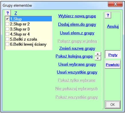 Ułatwia to analizę wyników i prowadzenie dodatkowych analiz, np.: wymiarowań. Jeśli jest to model mieszany można go ograniczyć do prętów lub powłok; przyciski Pręty i Powłoki. Takie same opcje są w menu Fragment. Przycisk Wybierz nową grupę pozwala przydzielić wybrane elementy do kolejnej grupy. Dodaj elem. do grupy będzie dostępna tylko po wybraniu jednej grupy i pozwala dodawać wybrane elementy do tej grupy. Przycisk Usuń elem. z grupy tę będzie dostępny tylko po wybraniu jednej grupy i pozwala usunąć wybrane elementy z grupy. Jeśli wybierzemy więcej niż jedną grupę będzie można ją połączyć przyciskiem Połącz grupy w jedną. Można zmienić nazwę grupy, pokazać kolejną grupę, usunąć wybrane grupę oraz usunąć wszystkie grupy. Jeśli wybrano więcej niż jedną grupę i mniej niż wszystkie grupy to można je pokazać, przycisk Pokaż tylko wybrane lub je pominąć - przycisk Nie pokazuj wybranych. Po ograniczeniu pokazywanych grup można przywrócić wszystkie grupy przyciskiem Pokaz wszystkie grupy.