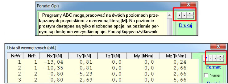 W oknach pokazujących porady, listy i zestawienia tabelaryczne wprowadzono dwa nowe przyciski.
