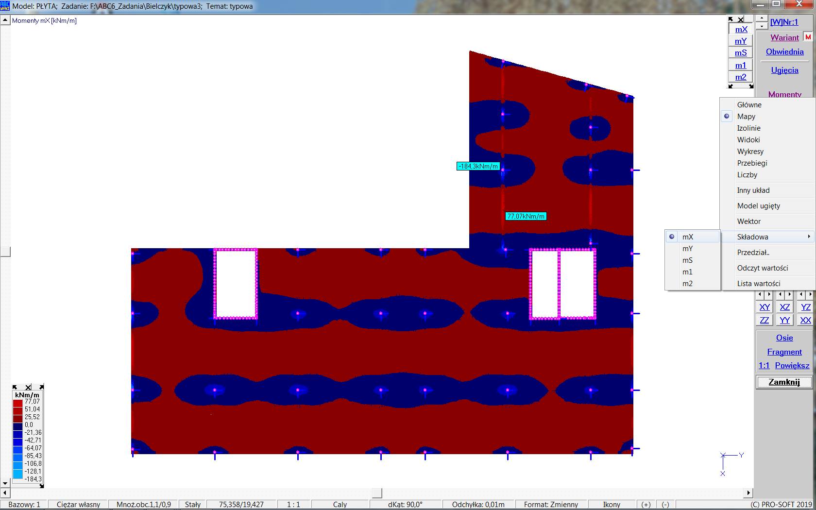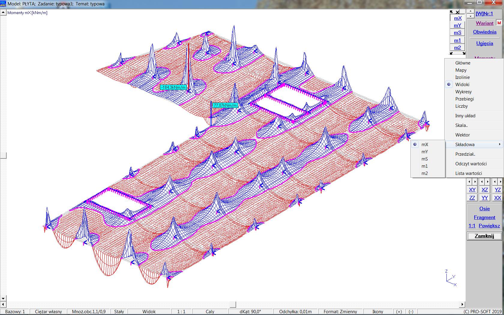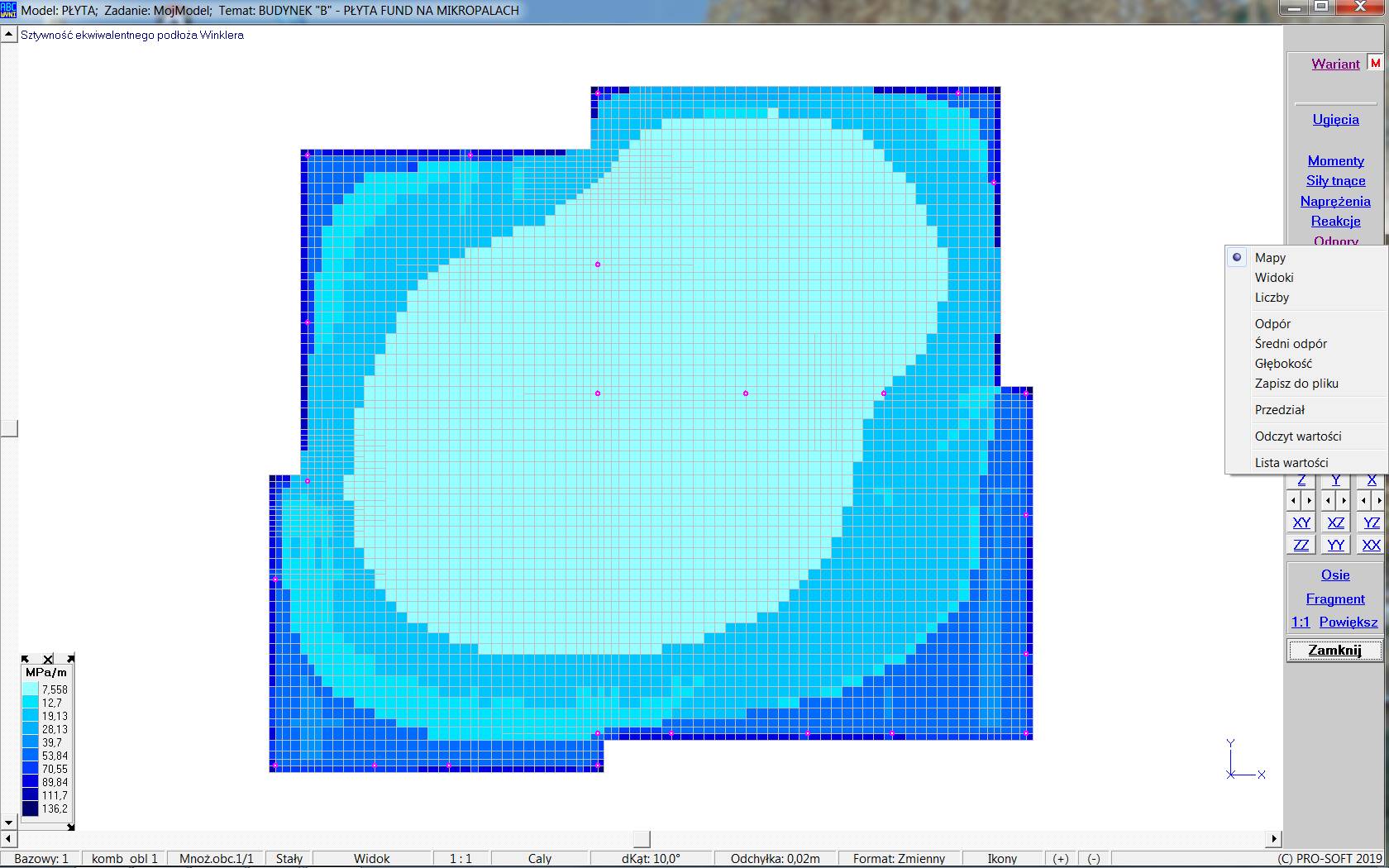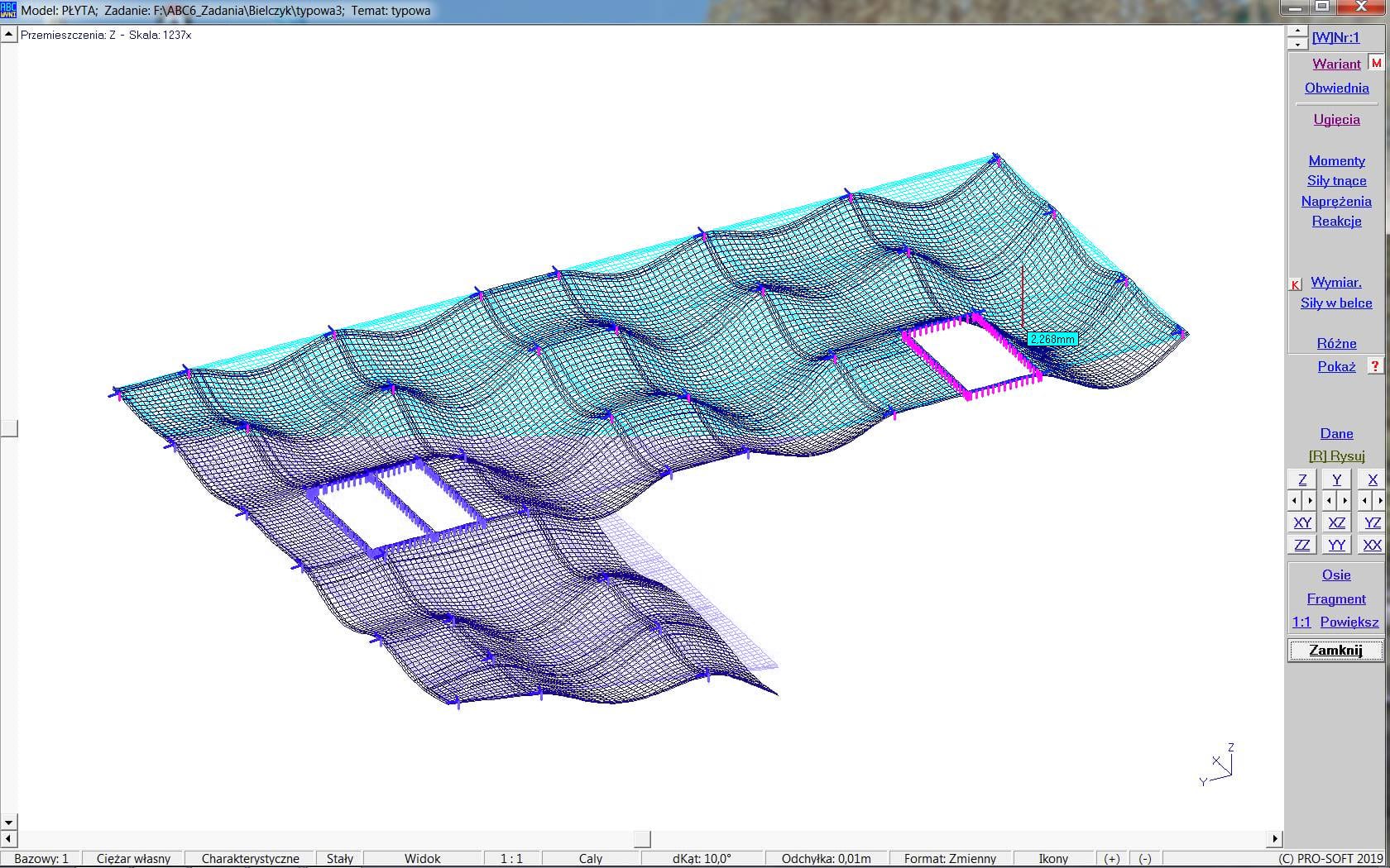 Po zakończeniu obliczeń program prezentuje deformację płyty, co ułatwia weryfikację poprawności modelu. Wyniki są dostępne w postaci ugięć, momentów, sił poprzecznych, reakcji podporowych oraz momentów utwierdzenia. W przypadku płyt fundamentowych prezentowane są również odpory gruntu.