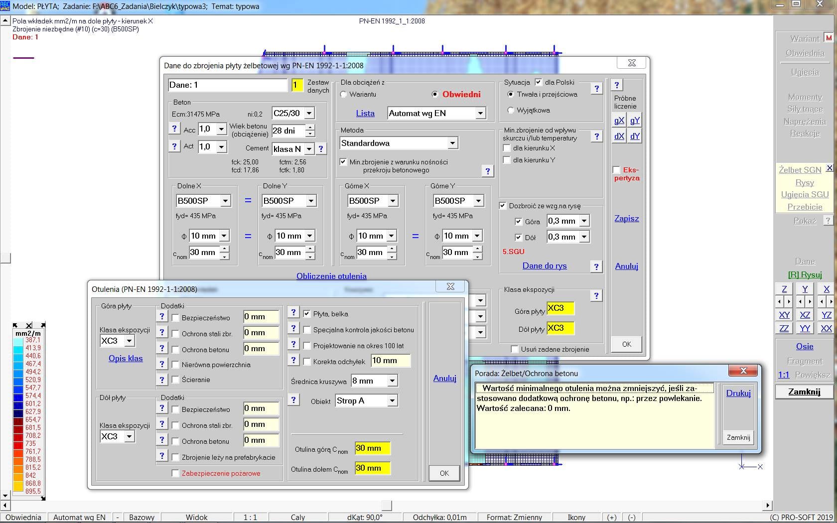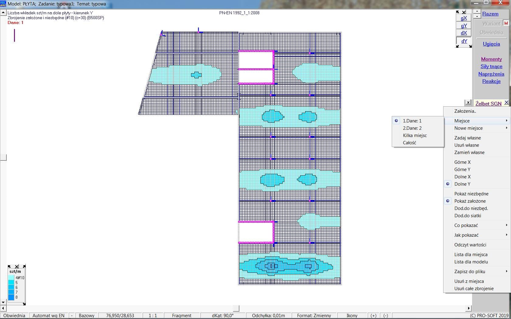Użytkownik może zdefiniować własne zbrojenie stałe (podstawowe). Program uwzględnia je w obliczeniach i wskazuje jedynie miejsca wymagające dozbrojenia. Gotowe rysunki rozkładu zbrojenia mogą być drukowane bezpośrednio lub eksportowane przez schowek do zewnętrznych systemów CAD.