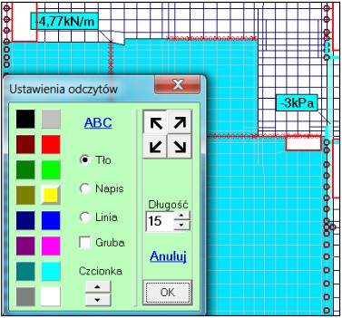 Dokonując odczytu dowolnej wielkości, po naciśnięciu prawego przycisku myszy, pokaże się menu z opcją Ustawienia odczytu. Po wybraniu tej opcji pokaże się okno, w którym można wybrać kolor tła, napisu i linii. Ta ostatnia może być pogrubiona. Do tego można zmienić wielkość czcionki odczytu. Ponadto można zmienić wstępną odległość plakietki od wskazanego miejsca oraz kierunek odniesienia. Jeśli będą odczyty to po naciśnięciu prawego przycisku myszy pokaże się menu z dwiema opcjami. Odczyty będzie można usunąć lub zmienić ustawienia.