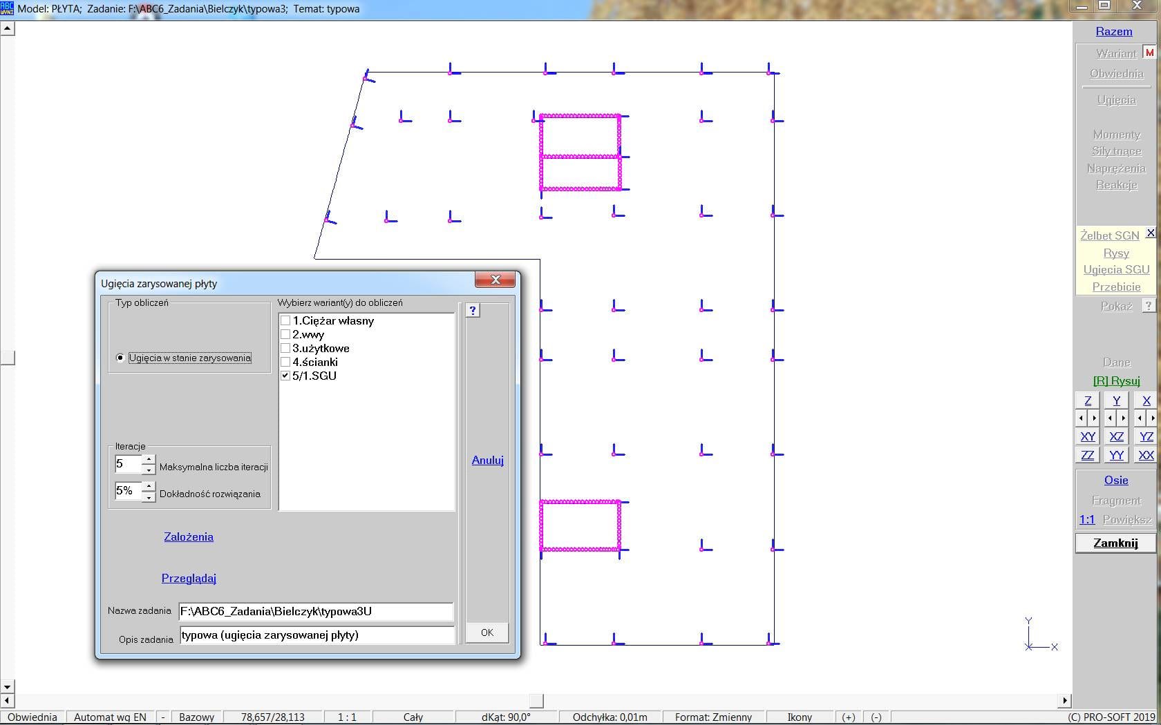 Po zakończeniu obliczeń program prezentuje deformację płyty, co ułatwia weryfikację poprawności modelu. Wyniki są dostępne w postaci ugięć, momentów, sił poprzecznych, reakcji podporowych oraz momentów utwierdzenia. W przypadku płyt fundamentowych prezentowane są również odpory gruntu.